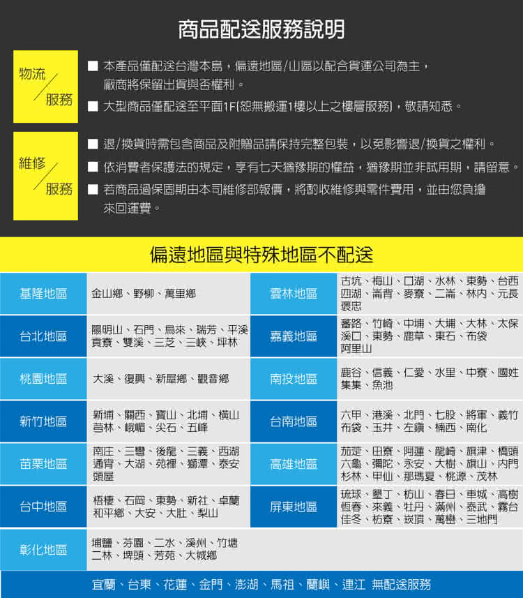 如網頁所標示之偏遠地區(由本司認定之)與外島地區不配送,也不在服務範圍內!